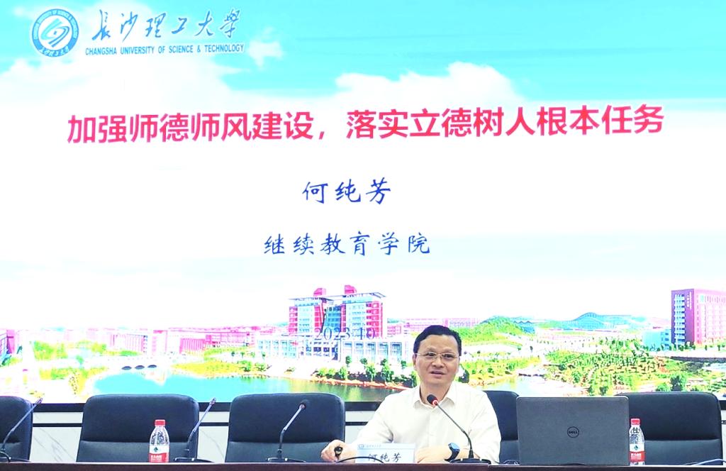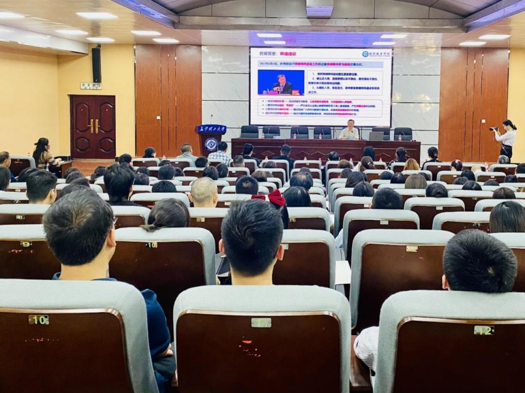 为深入学习贯彻习近平新时代中国特色社会主义思想主题教育,把师德师风建设摆在更重要位置,推进学校本科教育教学审核评估工作,10月17日下午,继教学院在金盆岭校区四号教学楼报告厅开展“加强师德师风建设,落实立德树人根本任务”专题教育活动,由学院党总支书记何纯芳作专题报告。本部助学中心、学籍学位与网络技术部等部门负责人及相关人员、合作办学机构全体教职工参加,学院副院长向英主持。