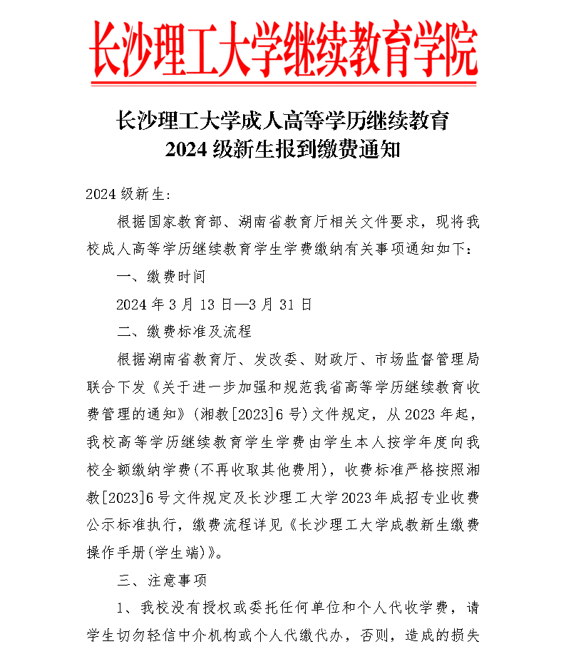 800cc全讯白菜网聽成人高等学历继续教育2024级新生报到缴费通知